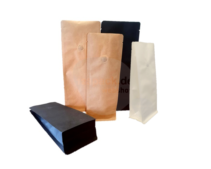 Onze platte bodemzakken /  box pouch hoge barrière met ventiel (ook wel blokbodemzakken genoemd) zijn een doorontwikkelde variant van de stazakken. Dankzij de vlakke, gelaste bodem staan ​​ze goed, zijn ze voedselveilig en kunnen ze met geschikte lasapparatuur worden afgesloten. Deze platbodemzakken zijn voorzien van een aromabeschermingsventiel, de koffiebonen in de zak zijn perfect beschermd tegen zuurstof of vreemde geuren. De versheid, het aroma en de kwaliteit van de koffie blijven optimaal behouden.